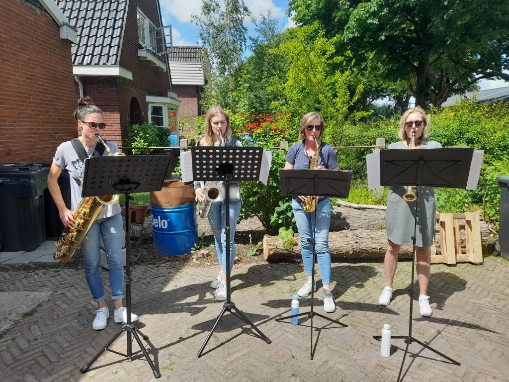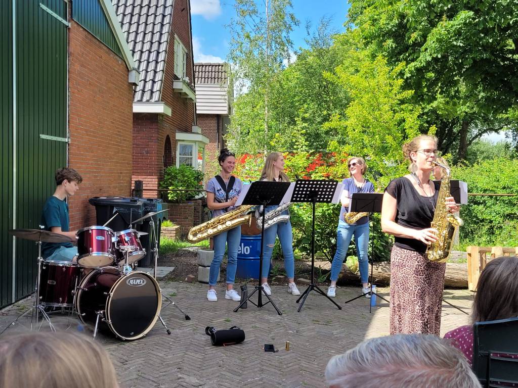 12 juni gaven leerlingen Anja, Anneke, Marije, Romy en drummer Mats, samen “Sax & Sticks”, een concertje bij It Pakhûs in Akkrum. Hier kunnen mensen met een verstandelijke beperking begeleid wonen. Op verzoek werd muziek van onder andere Abba, Jan Smit en Celine Dion gespeeld. Het was mooi weer en het was heel gezellig! Hieronder een kleine sfeerimpressie: