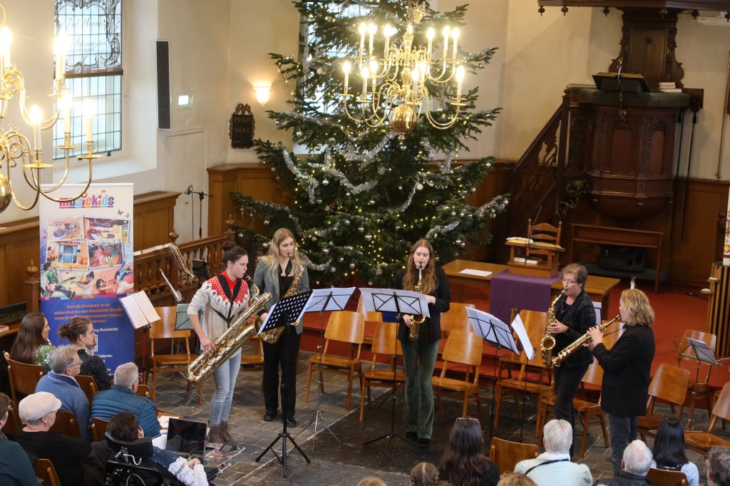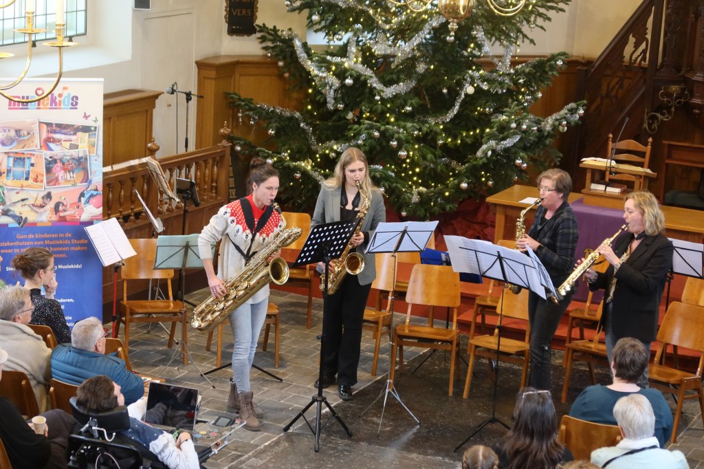 Na het nieuwjaarsconcert van vorig jaar, was het dit jaar tijd voor een kerstconcert. Deze keer met als doel een mooi bedrag op te halen voor stichting Muziekids. Deze stichting biedt kinderen, die kort of langdurig in ziekenhuizen verblijven, een “muzikale pleister om de pijn te verzachten’’. De patiëntjes krijgen de mogelijkheid om samen met andere kinderen en musici muziek te maken, zodat zij even kunnen ontsnappen aan het ziek zijn. Saxofoonkwartetten traden op bij Leppehiem, Marijkehiem, It Pakhûs, tijdens de kerkdienst in Akkrum en zelfs tijdens een kerstlunch van een basisschool in Oosterwolde. Tot slot sloten we met een grote groep saxofoonleerlingen af met een benefietconcert in de Terptsjerke in Akkrum. We hebben samen een prachtig bedrag opgehaald en Stichting Muziekids zal dit goed gaan besteden: https://muziekids.nl/acties/friese-saxofoons-in-kerstconcert-voor-muziekids/